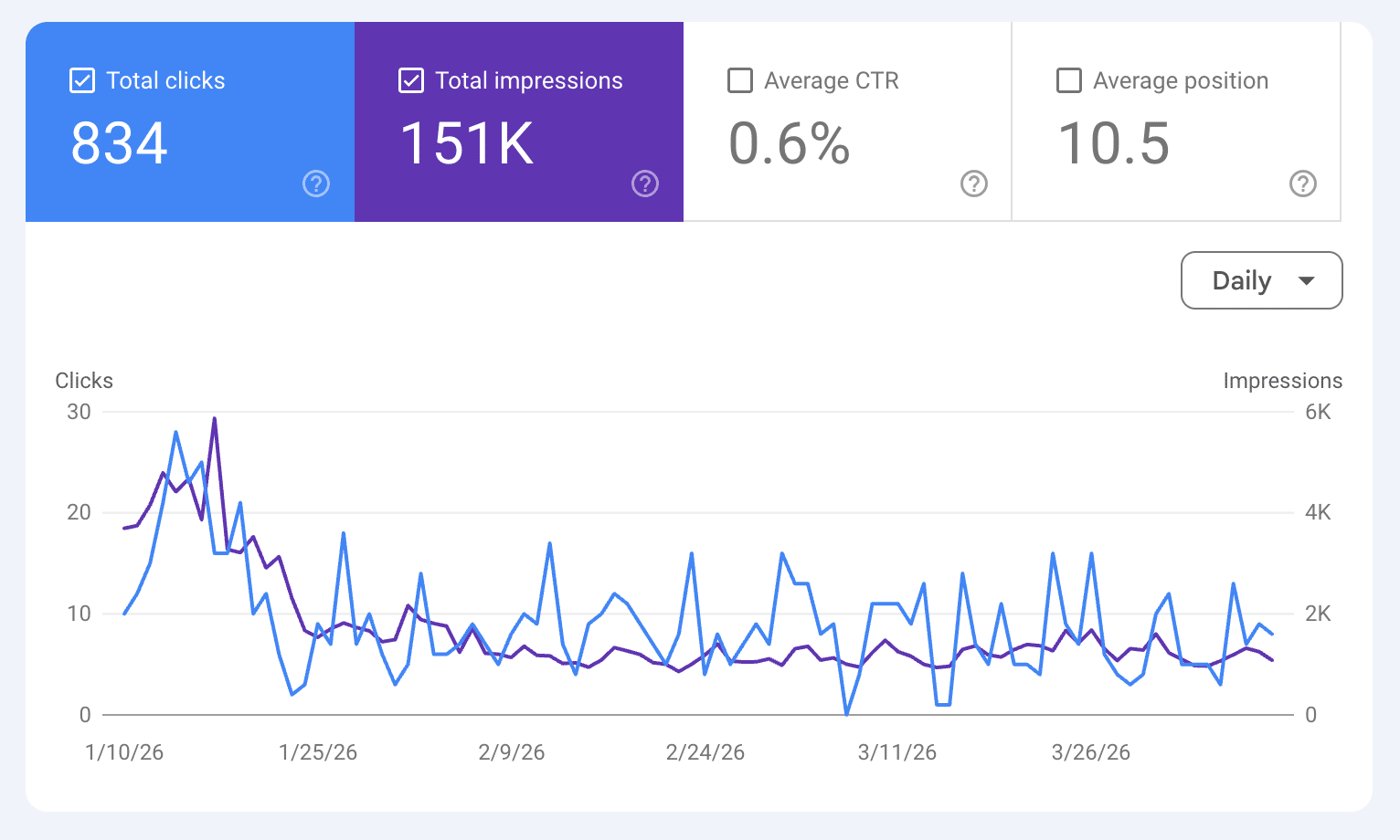 - Impressions slowly dip, clicks in freefall: pages still appearing in results but losing click-through because titles and meta descriptions were rewritten without testing.